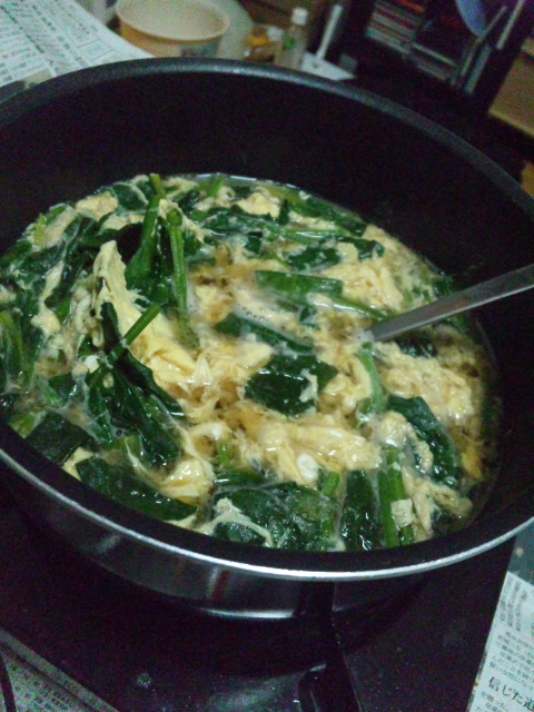 ほうれん草と卵の味噌汁!毟ろほうれん草の味噌煮卵とじ状態www ほうれん草まじうまい!
